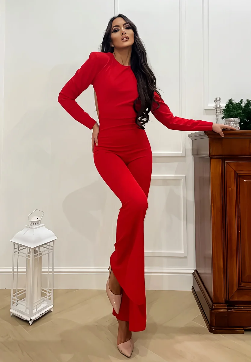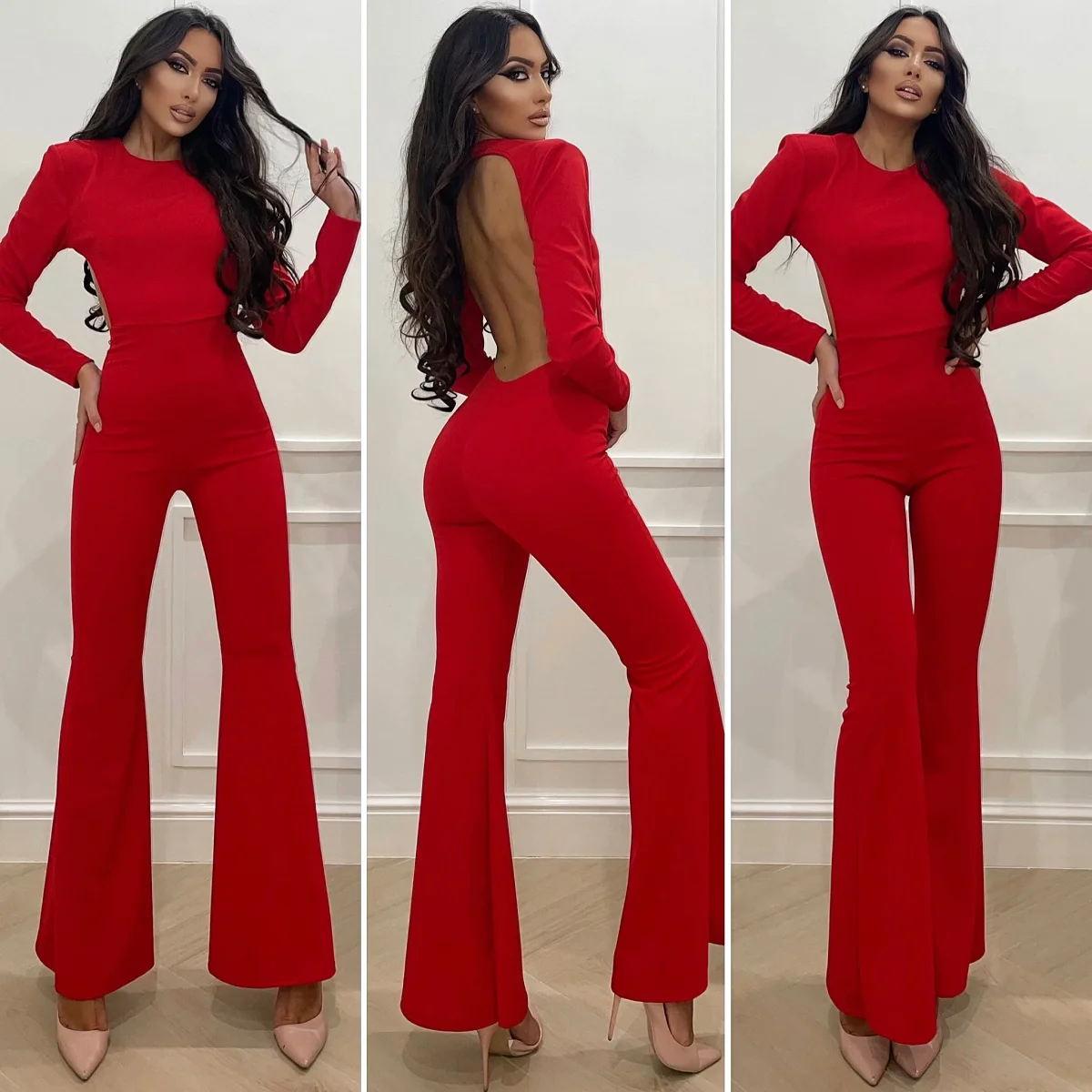Tuta nera in tessuto elasticizzato con pantalone a zampa schiena super sexy.