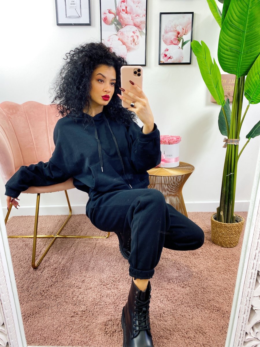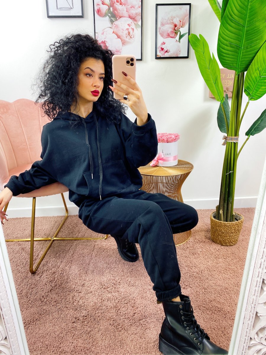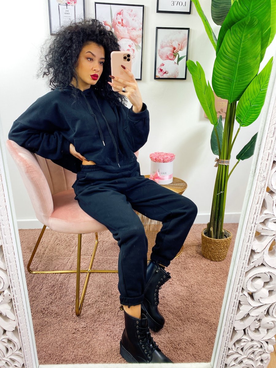 Tuta due pezzi composta da felpa con cappuccio, tasche e pantalone con polsino inferiore, comodissima.