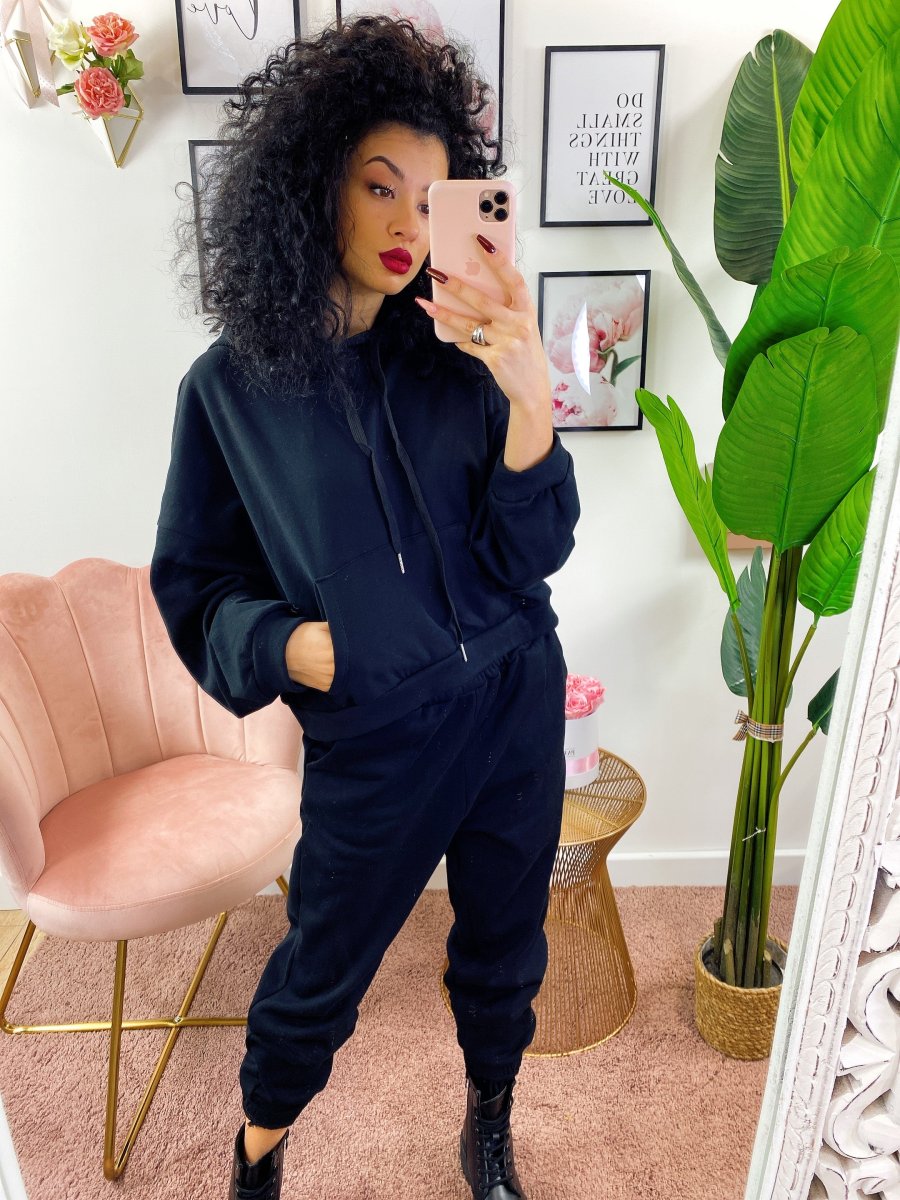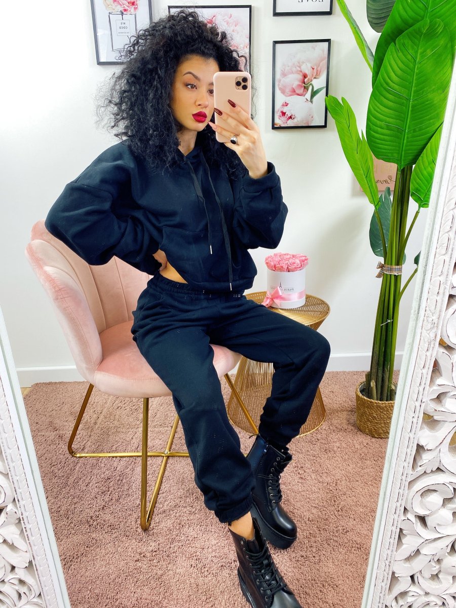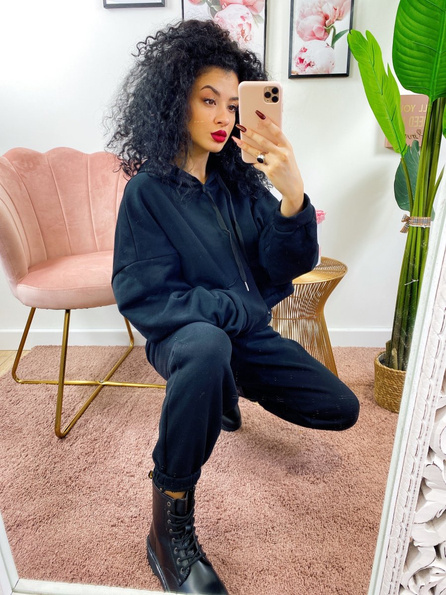 Tuta due pezzi composta da felpa con cappuccio, tasche e pantalone con polsino inferiore, comodissima.