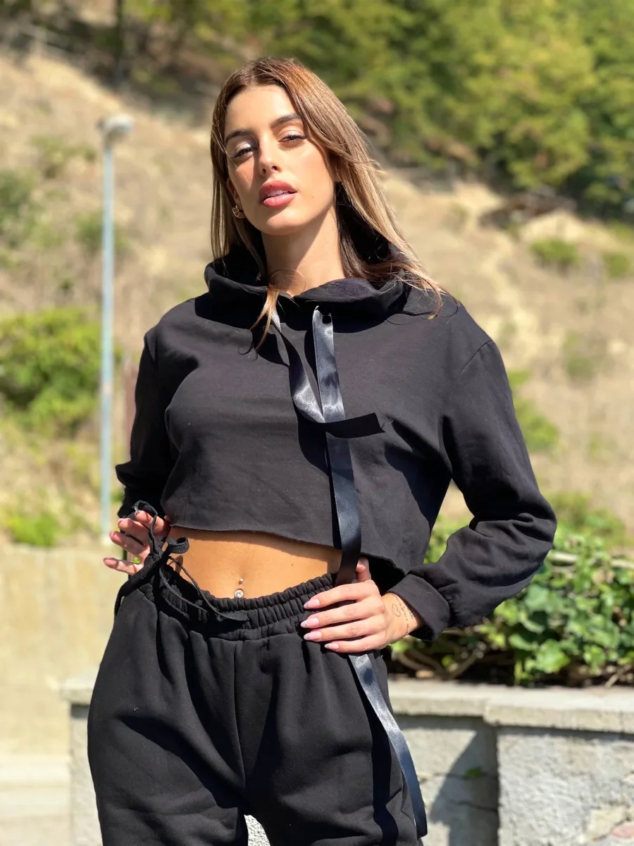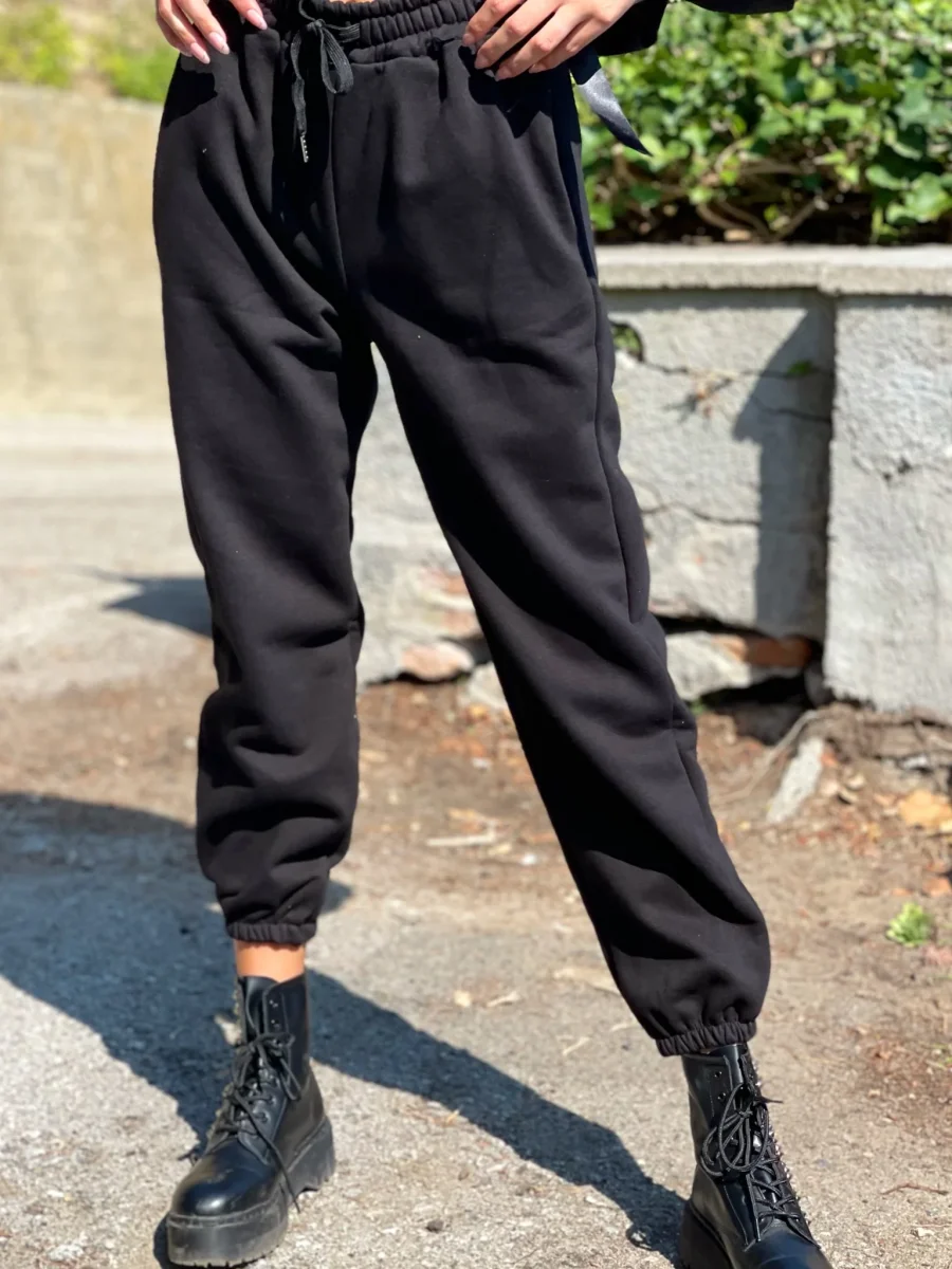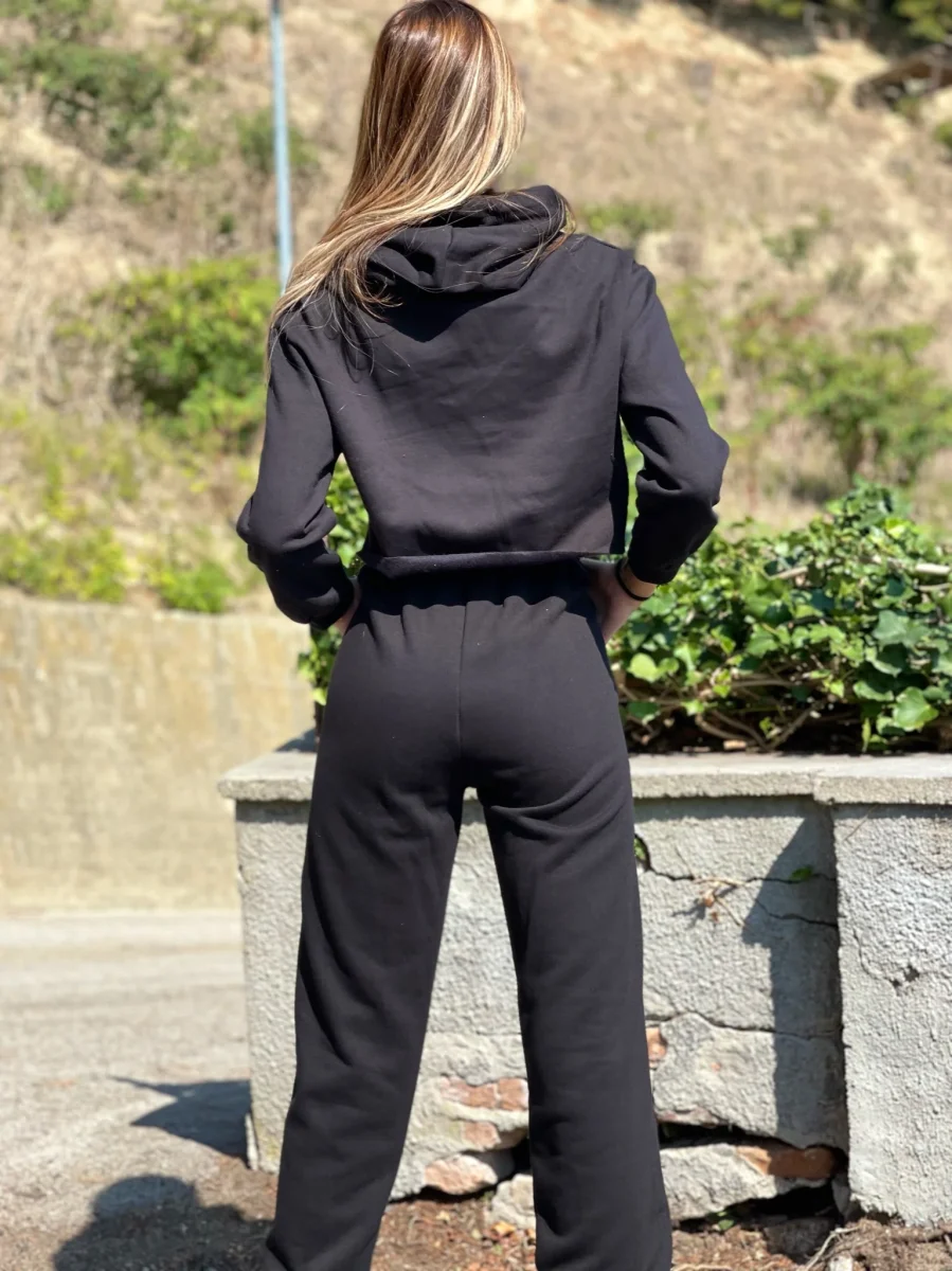 Tuta sportiva felpata nera, tessuto caldo e morbido. Due pezzi usabili anche singolarmente
