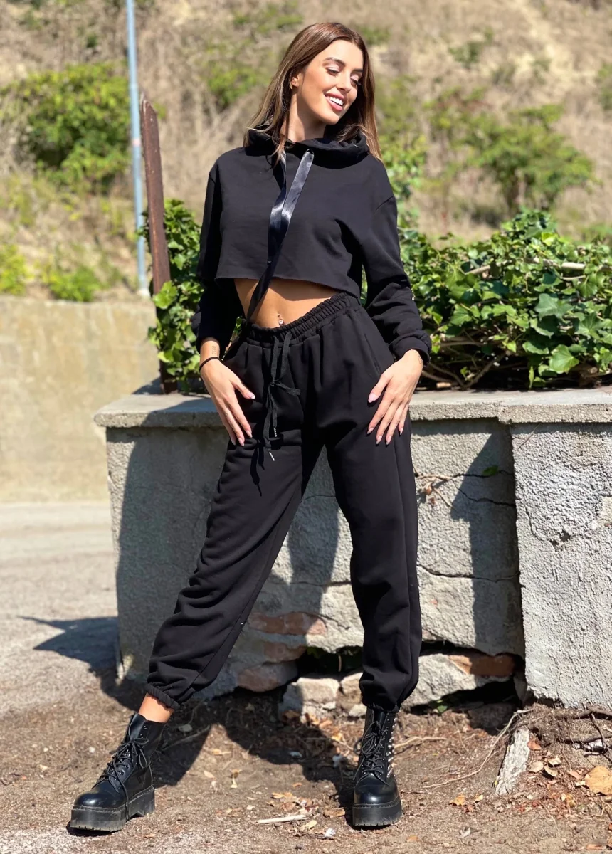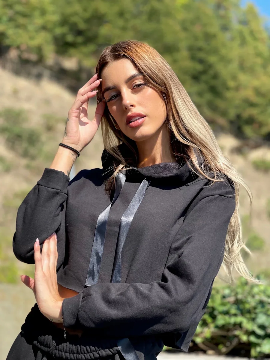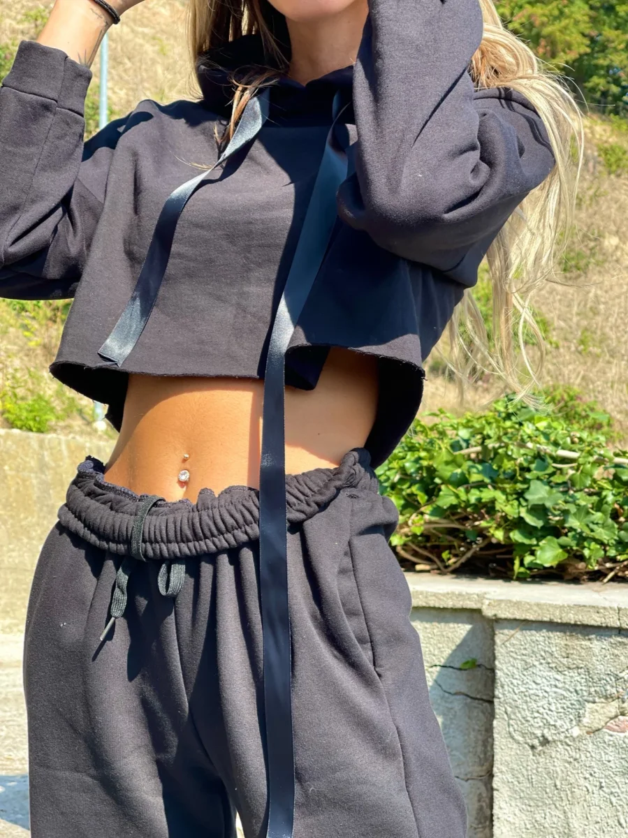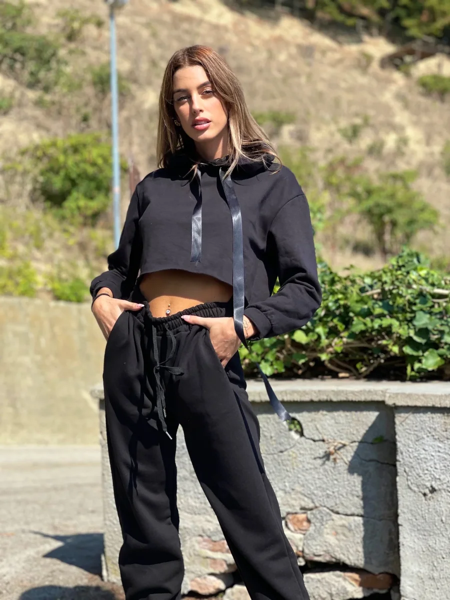 Tuta sportiva felpata nera, tessuto caldo e morbido. Due pezzi usabili anche singolarmente