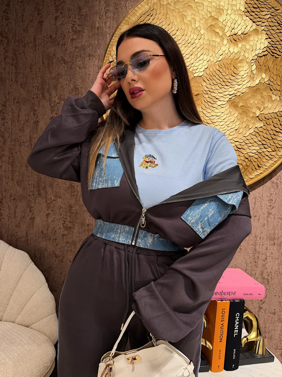 è il completo perfetto per un look casual ma super stiloso. Composta da felpa cropped con cappuccio e zip frontale abbinata a pantalone morbido, si distingue per i dettagli in denim effetto marmorizzato che creano un contrasto moderno e di tendenza.