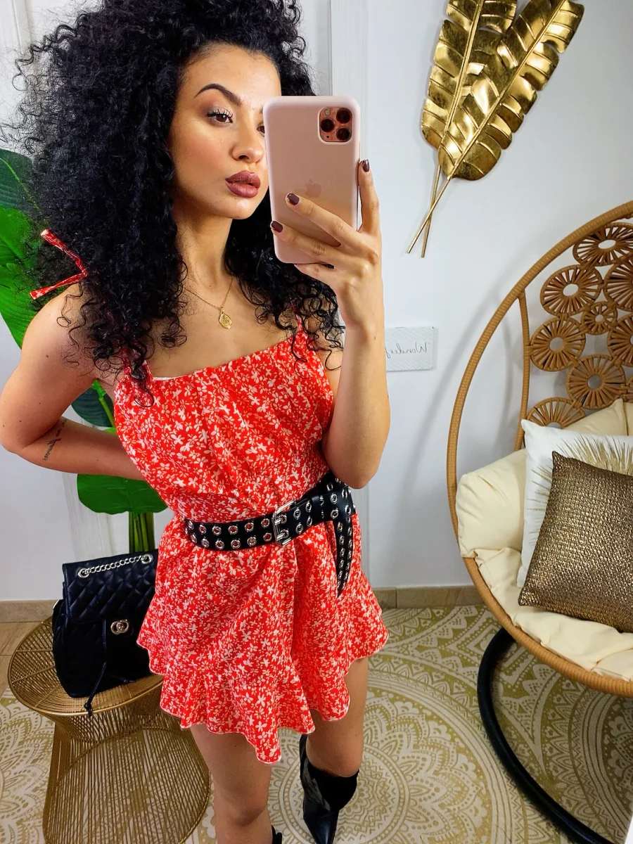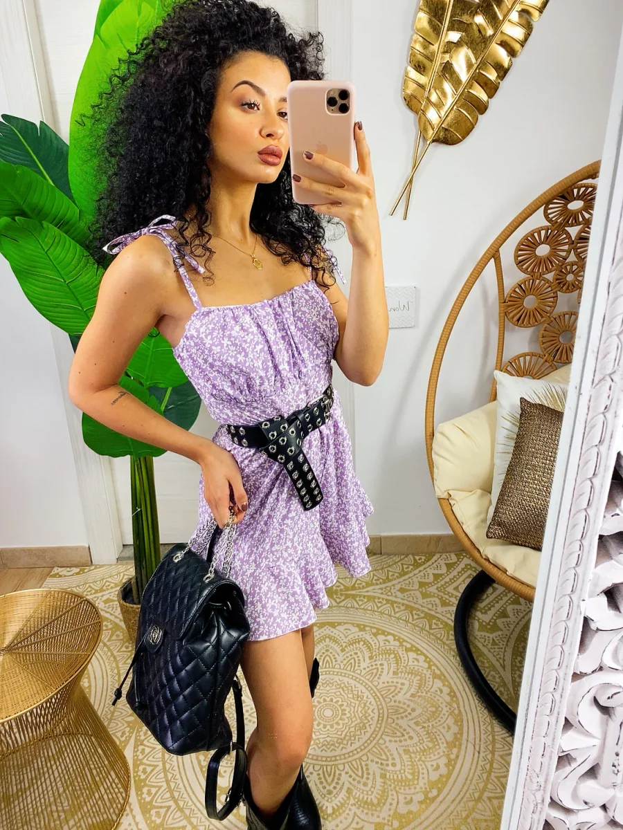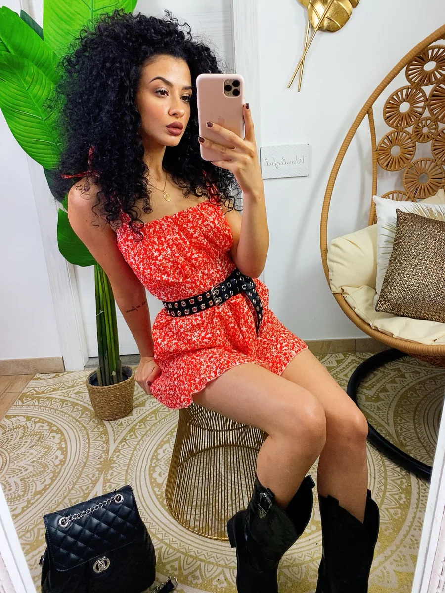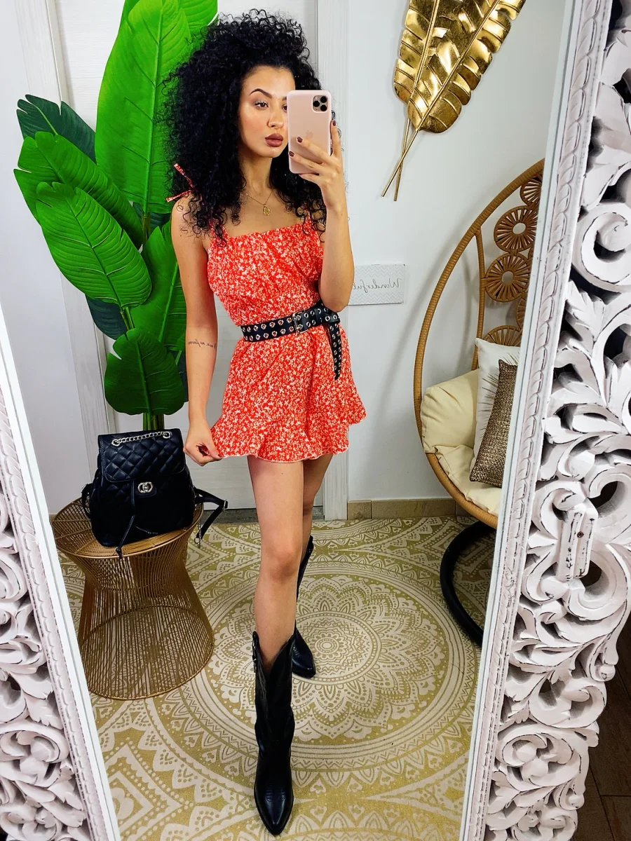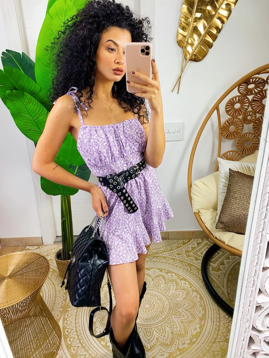 Deliziosa tutina con stampa a fiorellini bianchi, fiocchetti sulle spalle e elastico in vita.