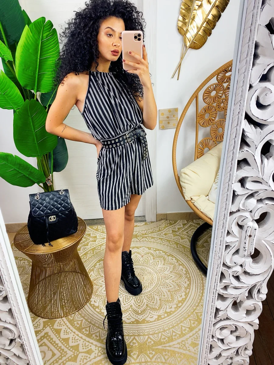 Abito casual in tessuto elasticizzato, chiusura con laccio dietro al collo e elastico in vita.