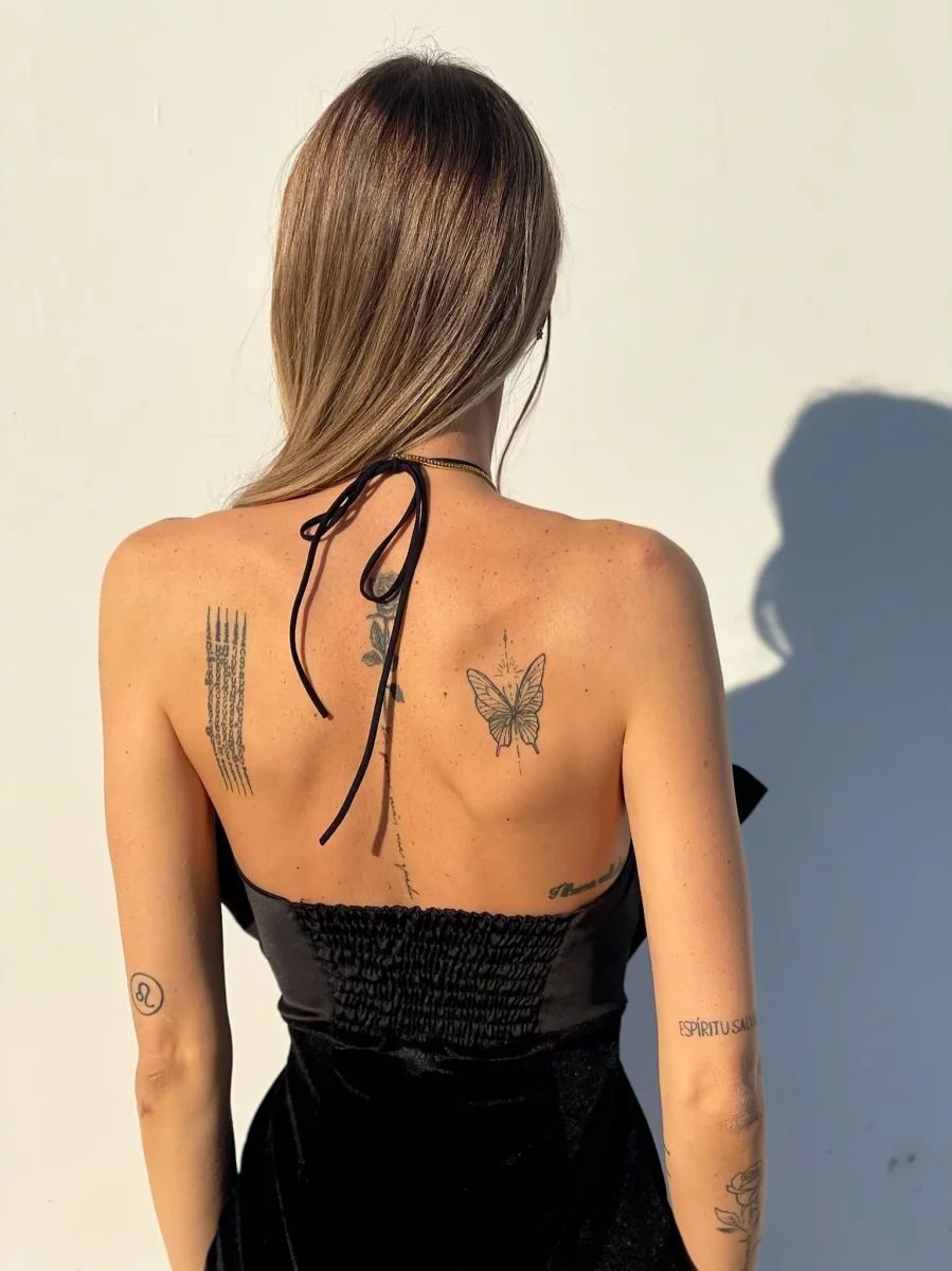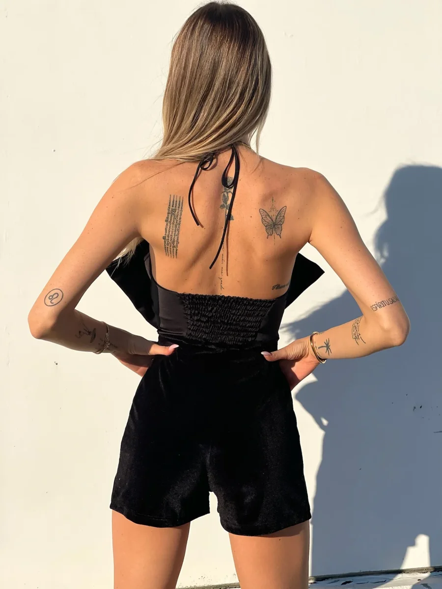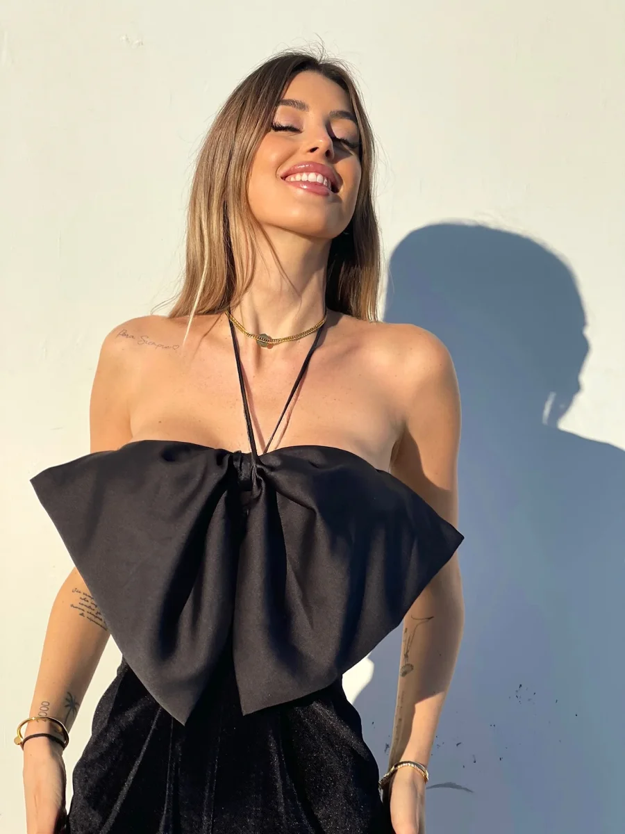 Tutina super glamour con un maxi fiocco in raso e chiusura intorno al collo e pantaloncino in velluto