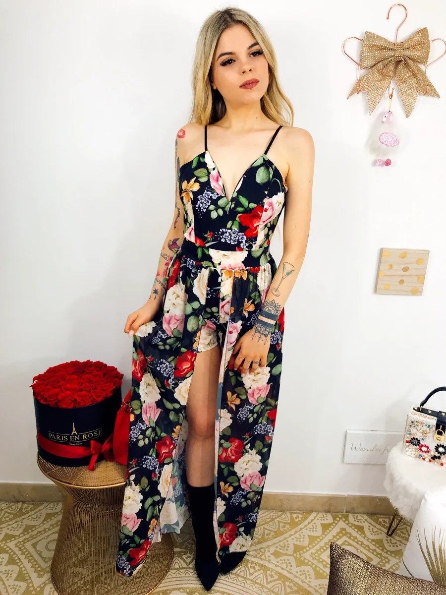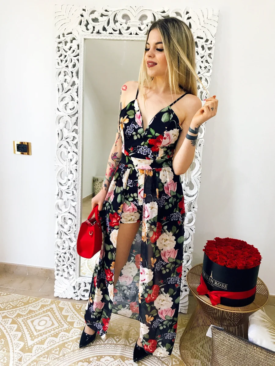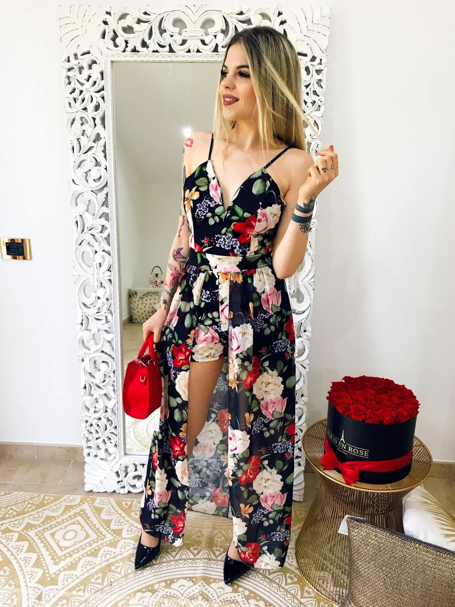 Tutina con maxi gonna sotto, scollo a V e bretelline regolabili con fantasia estiva floreale. Coppe incluse.