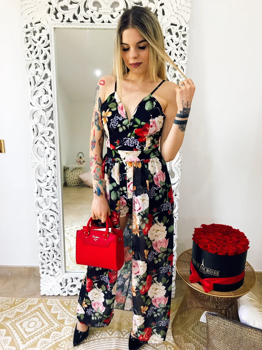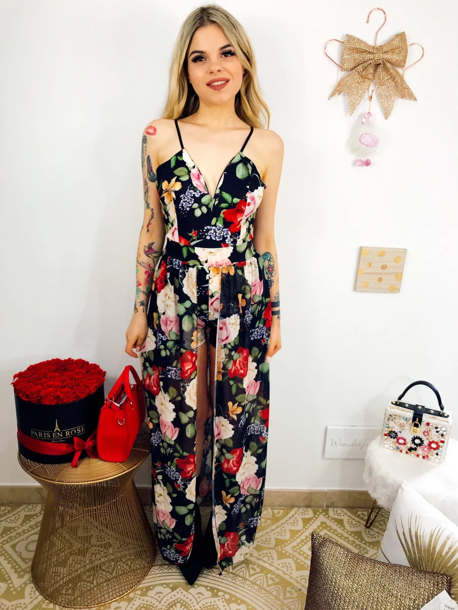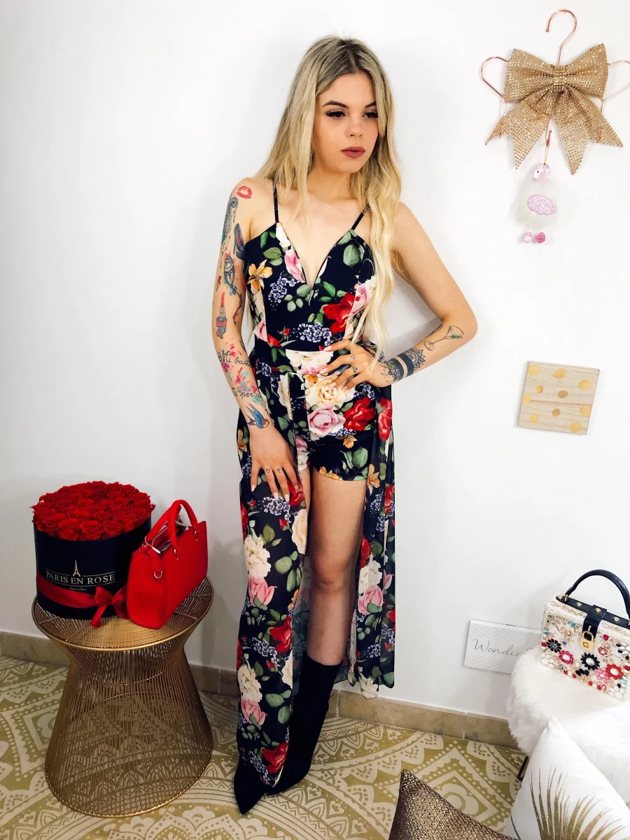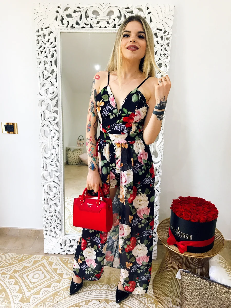 Tutina con maxi gonna sotto, scollo a V e bretelline regolabili con fantasia estiva floreale. Coppe incluse.