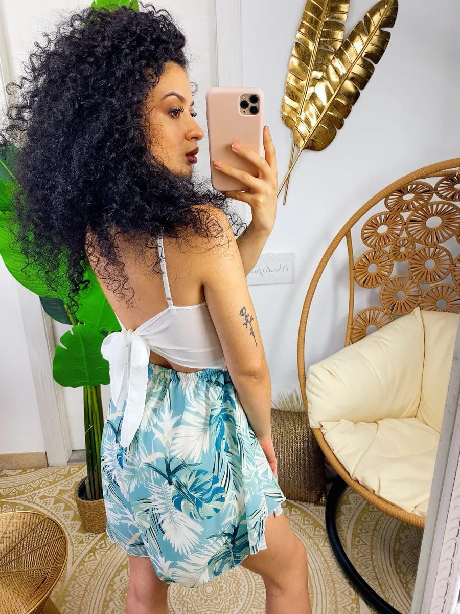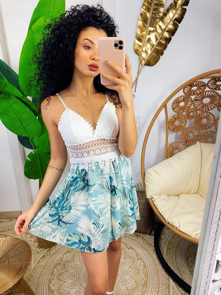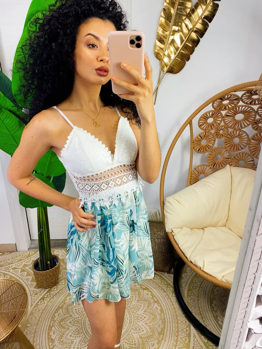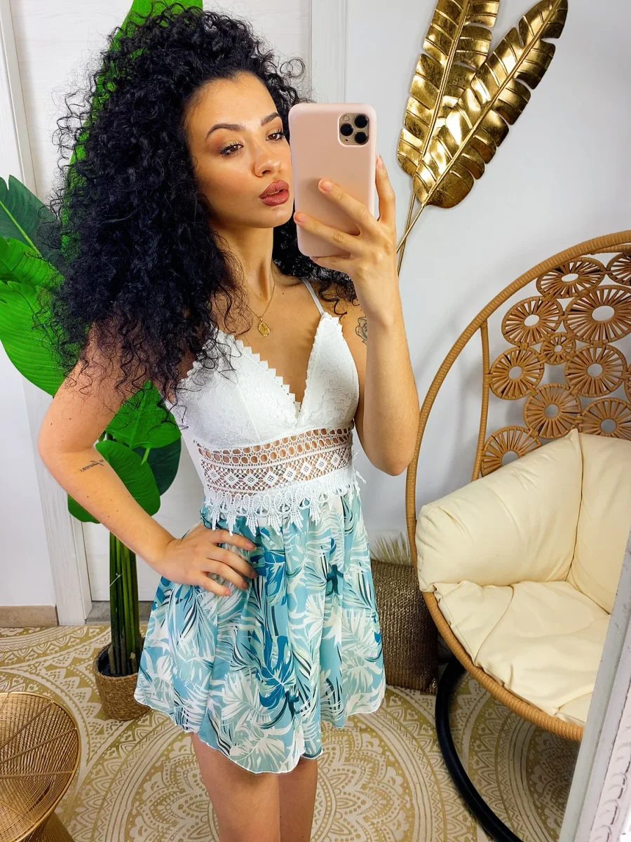 Tutina con corpino in pizzo bianco con coppe e pantaloncino a fantasia verde. Bretelle regolabili e chiusura con fiocco