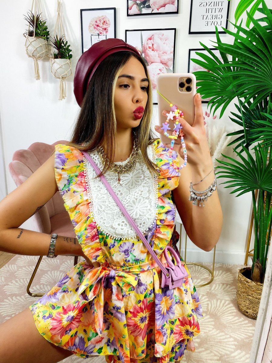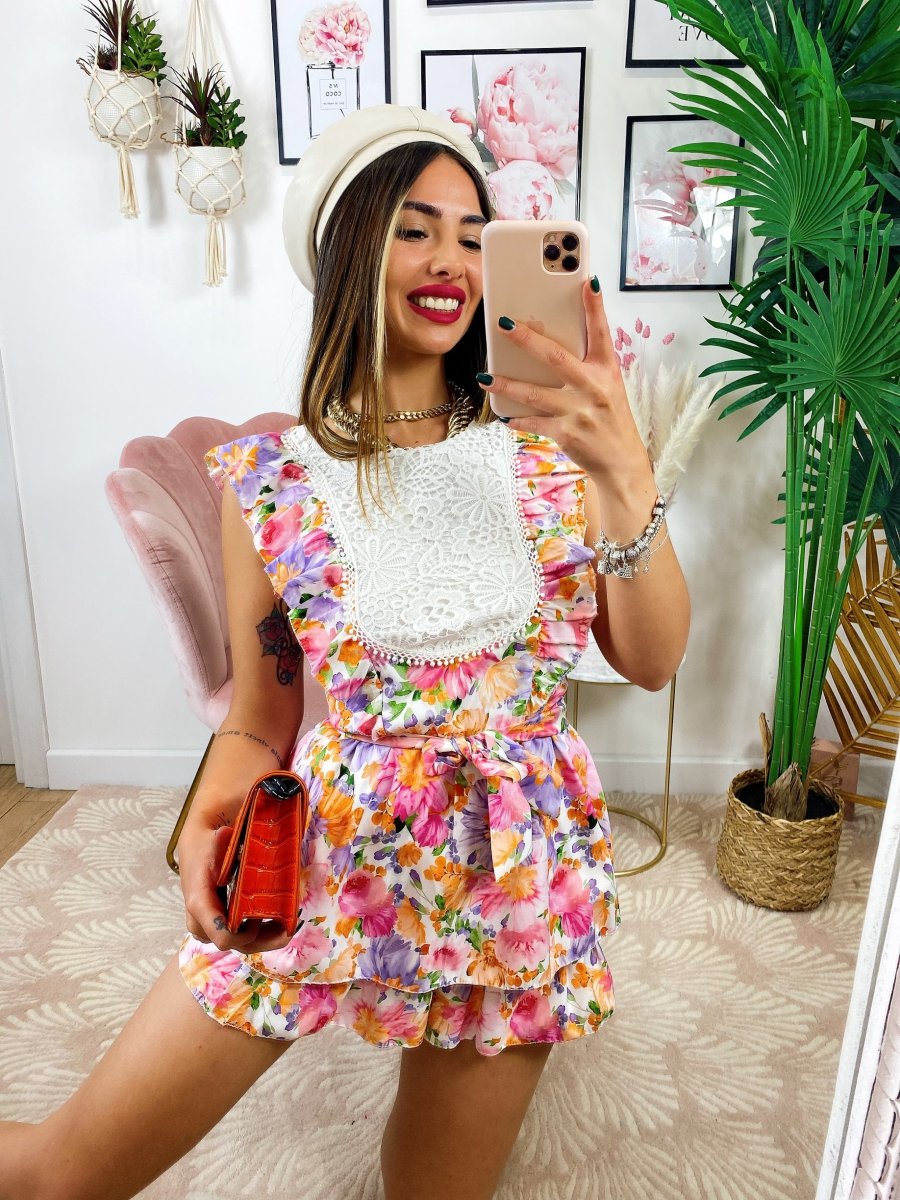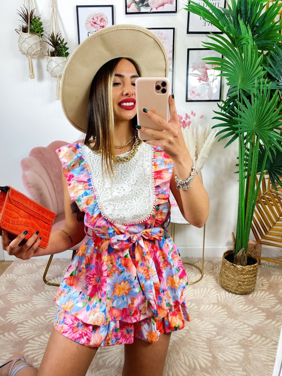 Tutina floreale con voilant e pizzo, cintura compresa con bottoncino posteriore per chiuderla.