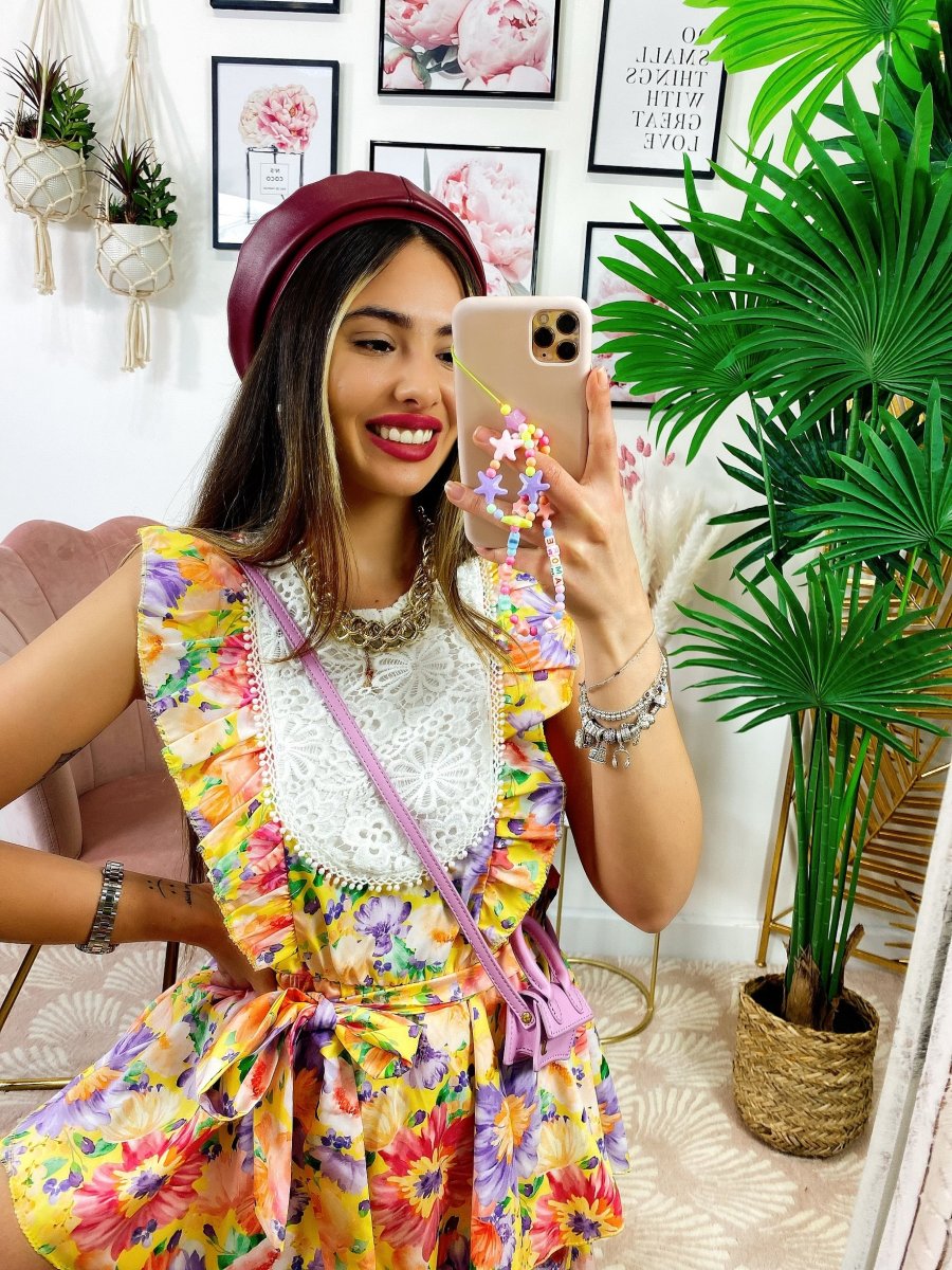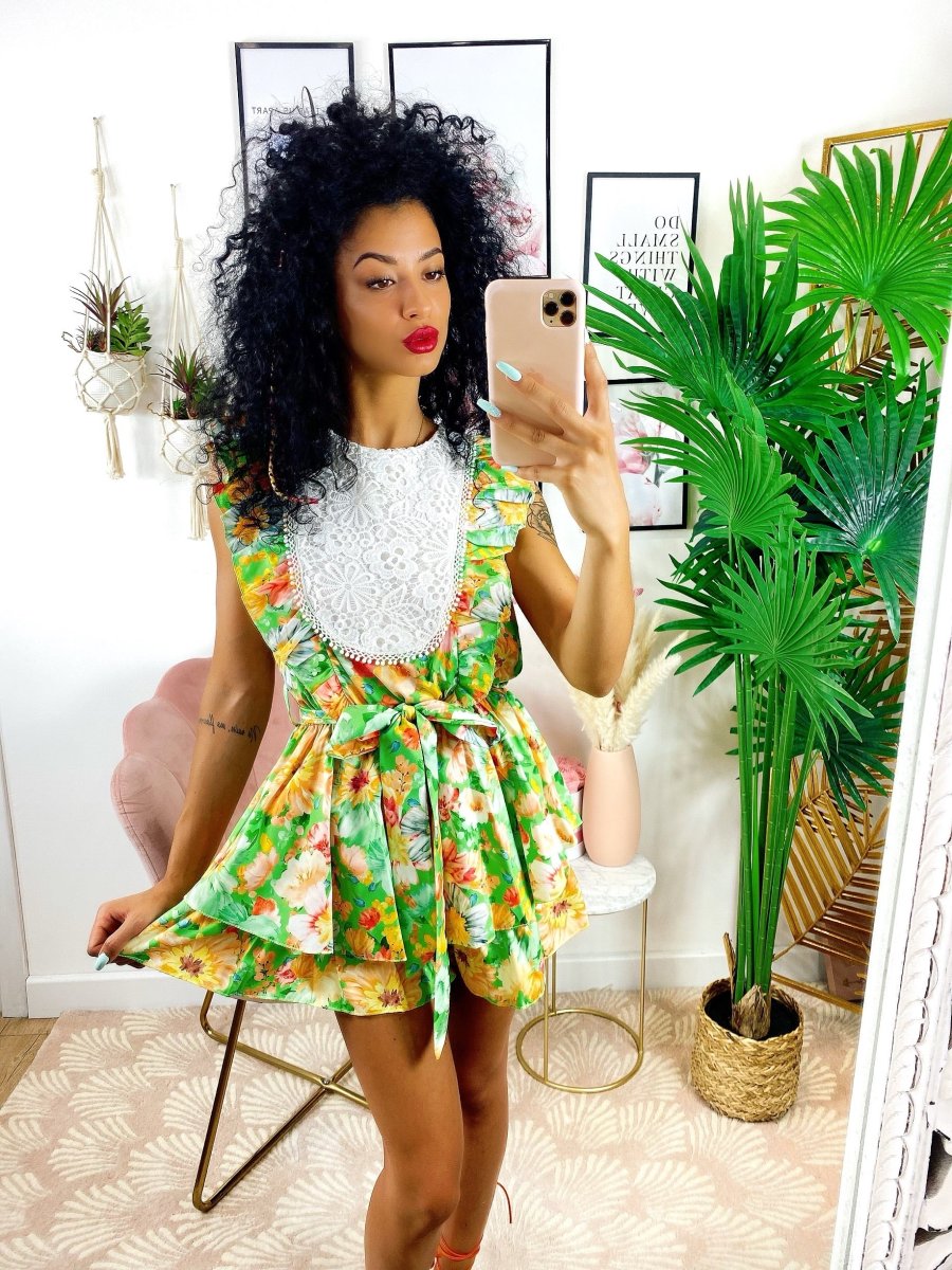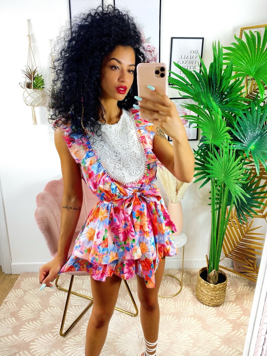 Tutina floreale con voilant e pizzo, cintura compresa con bottoncino posteriore per chiuderla.