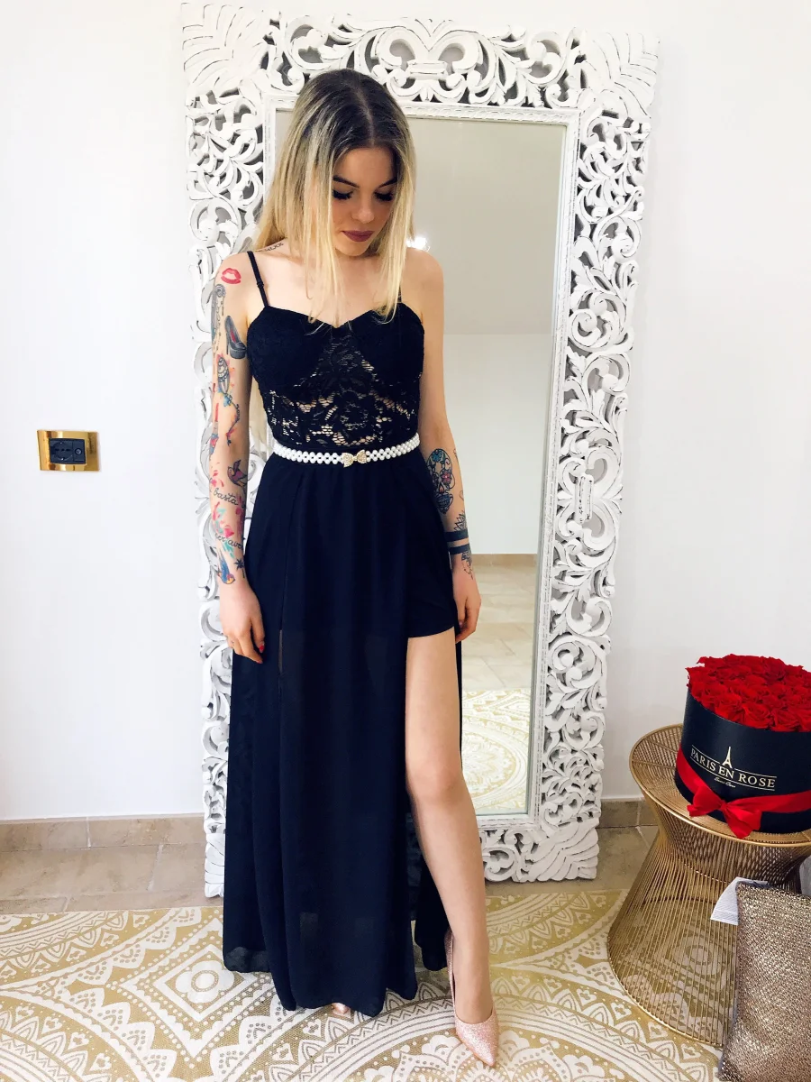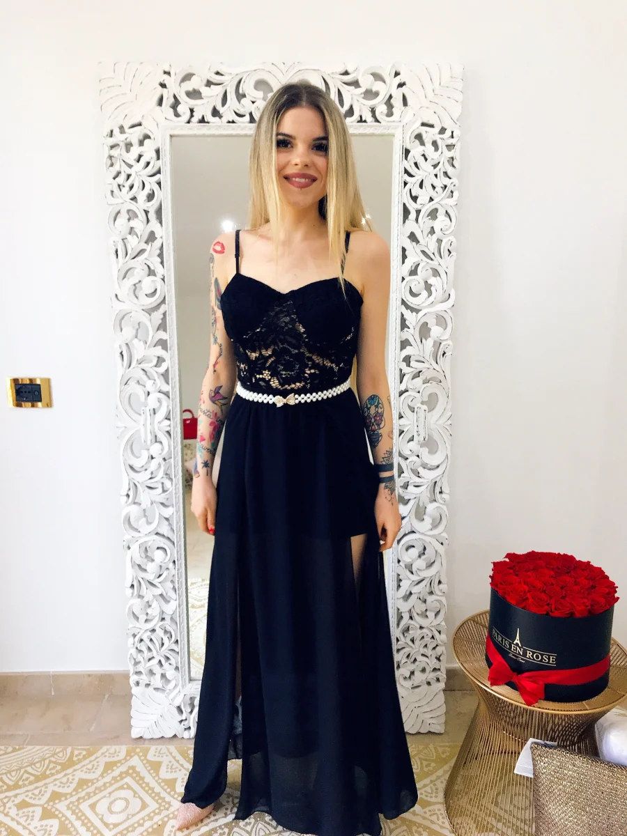 Tutina con scollo a barchetta e maxi gonna con spacchi.