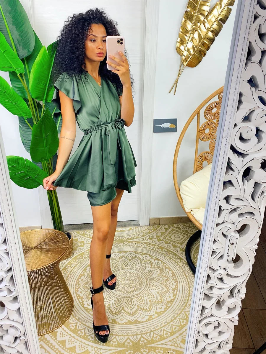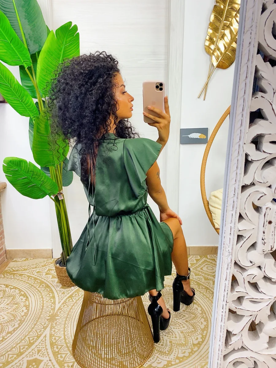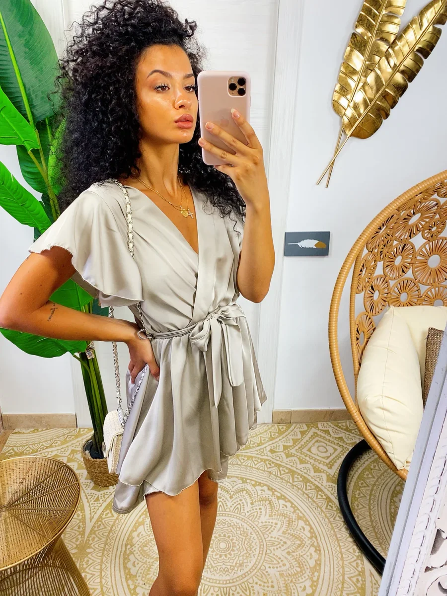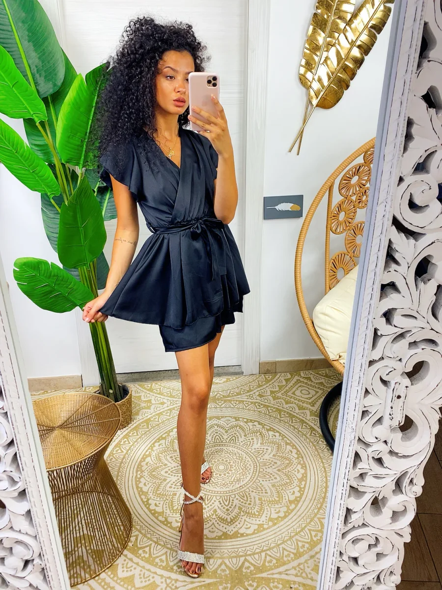 Tutina in raso in tessuto pesante con schiena aperta e fiocchettino sulla schiena. Cintura in vita a forma di fiocco.