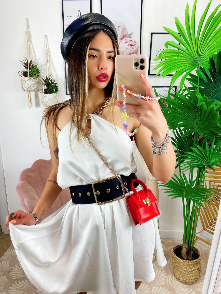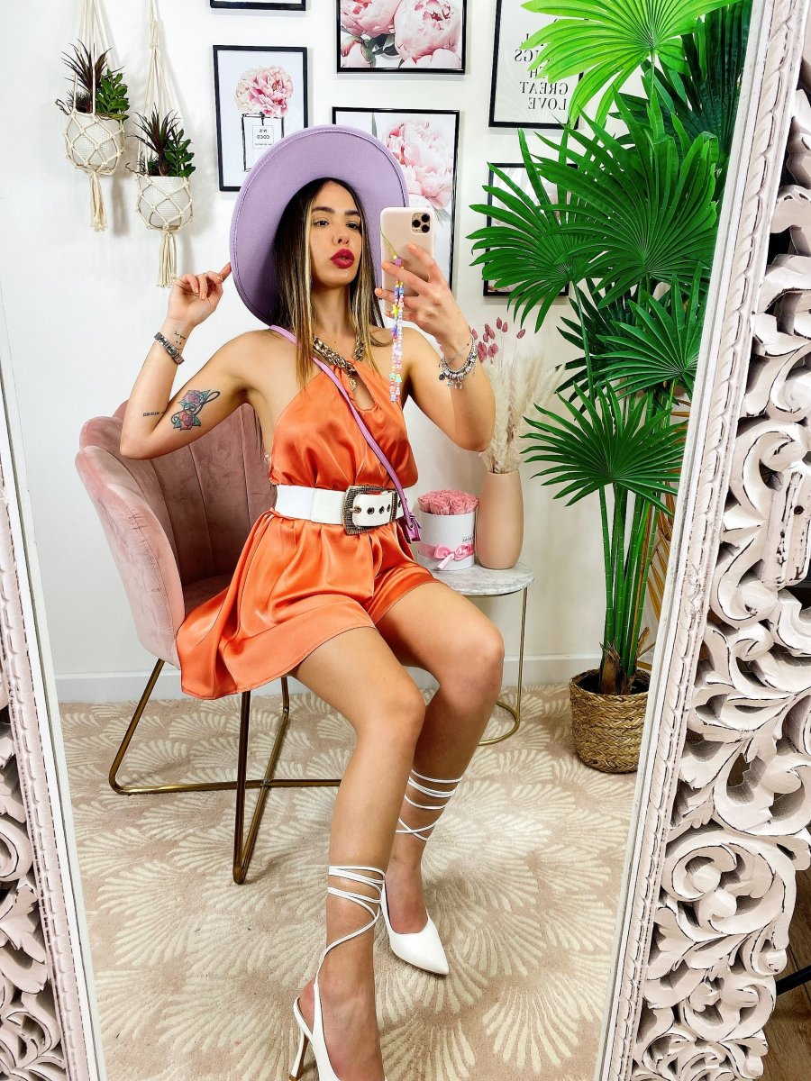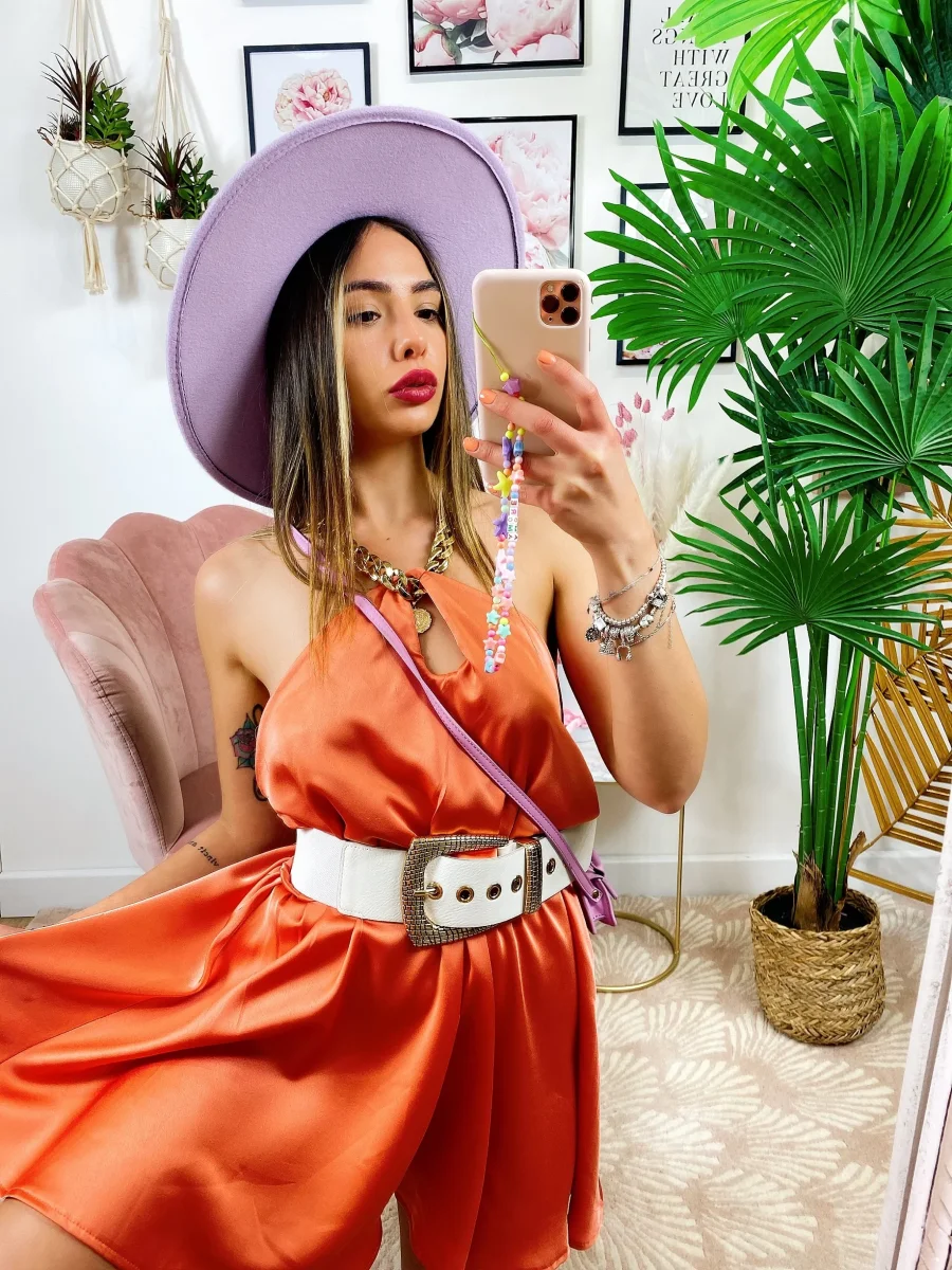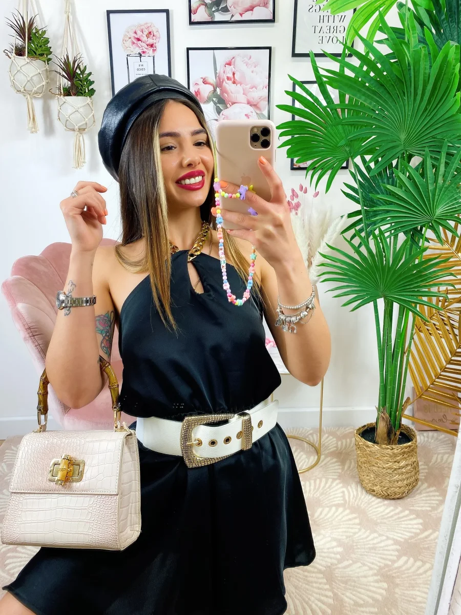 Tutina con catena al collo compresa, presenta l’elastico in vita, tessuto simil raso.