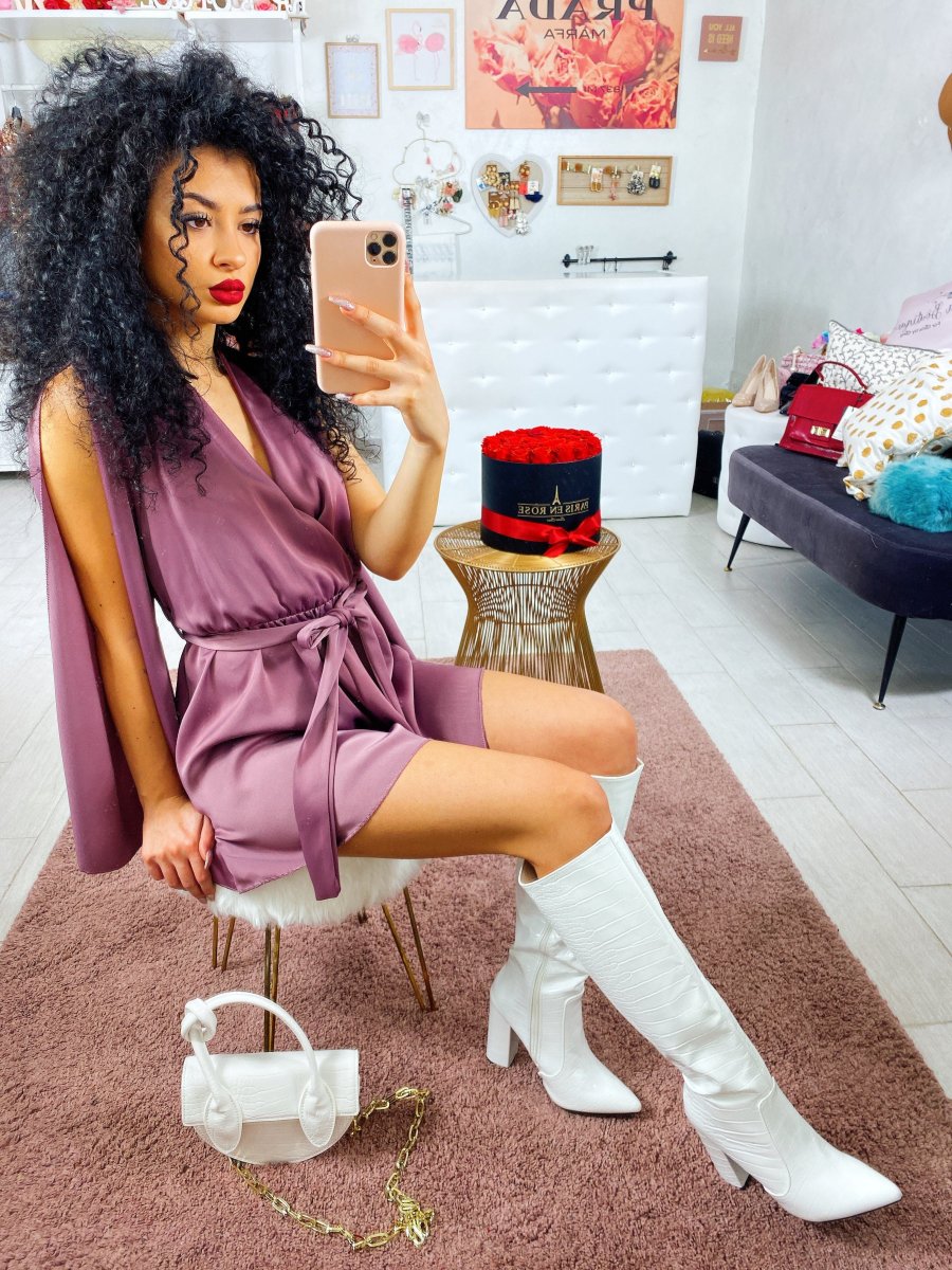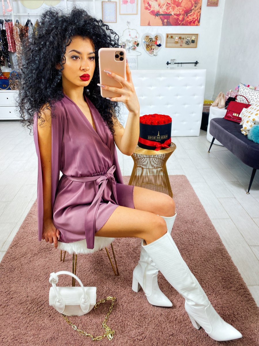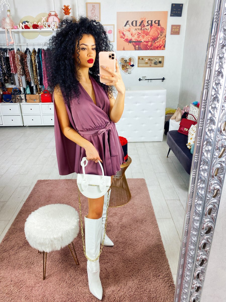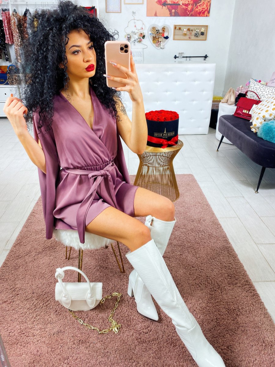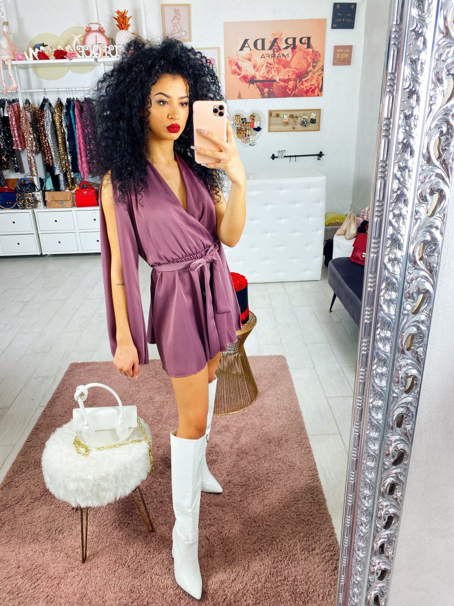 Tutina in tessuto leggero elasticizzato con maniche a pipistrello. Laccetto in vita tono su tono
