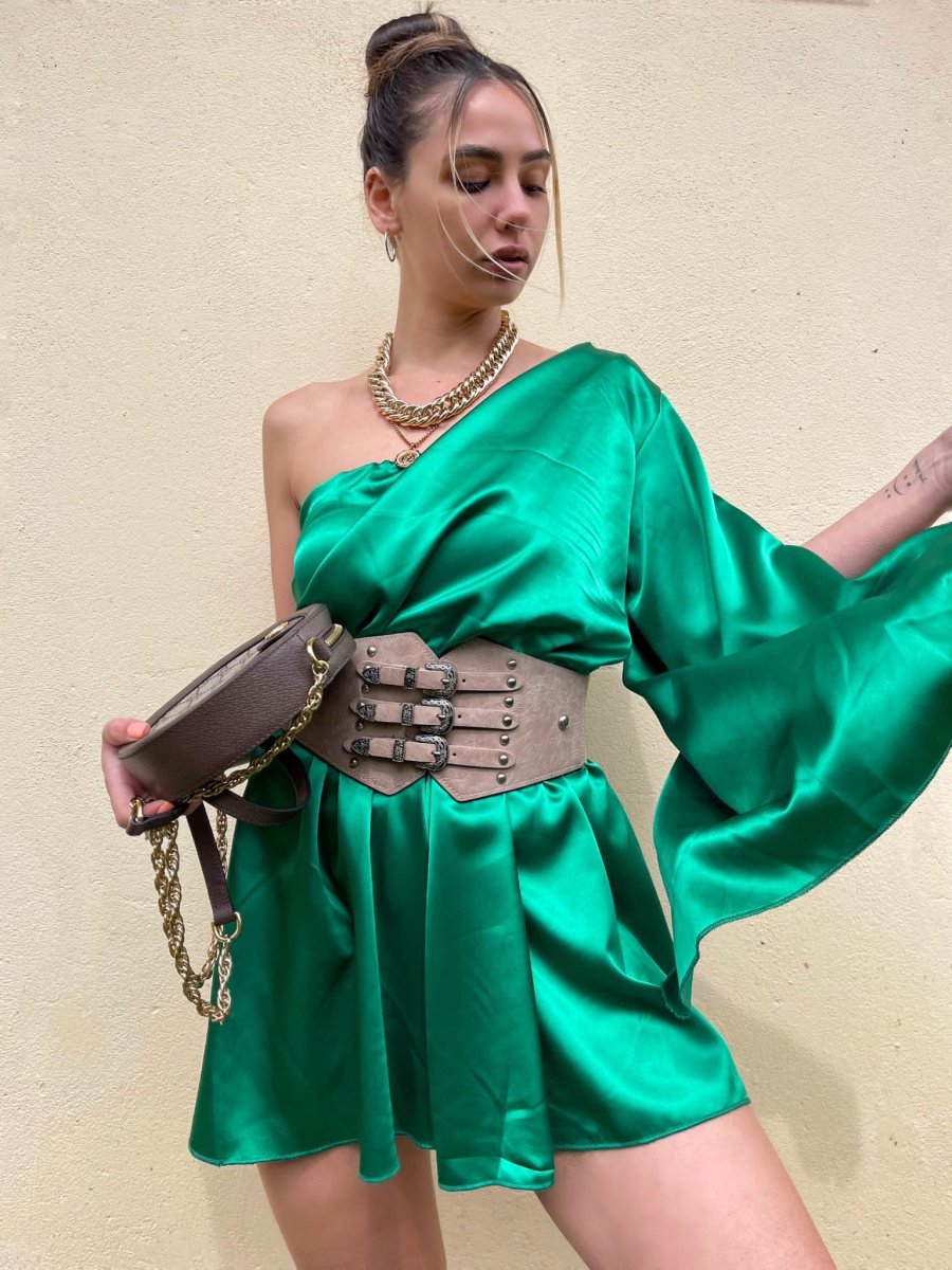 Tutina monospalla in Raso. Manica ampia e aperta
