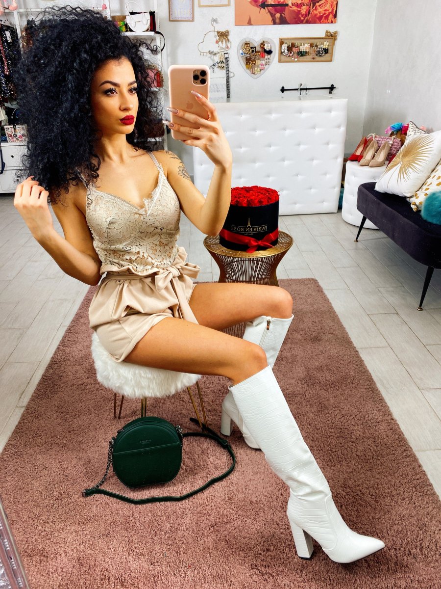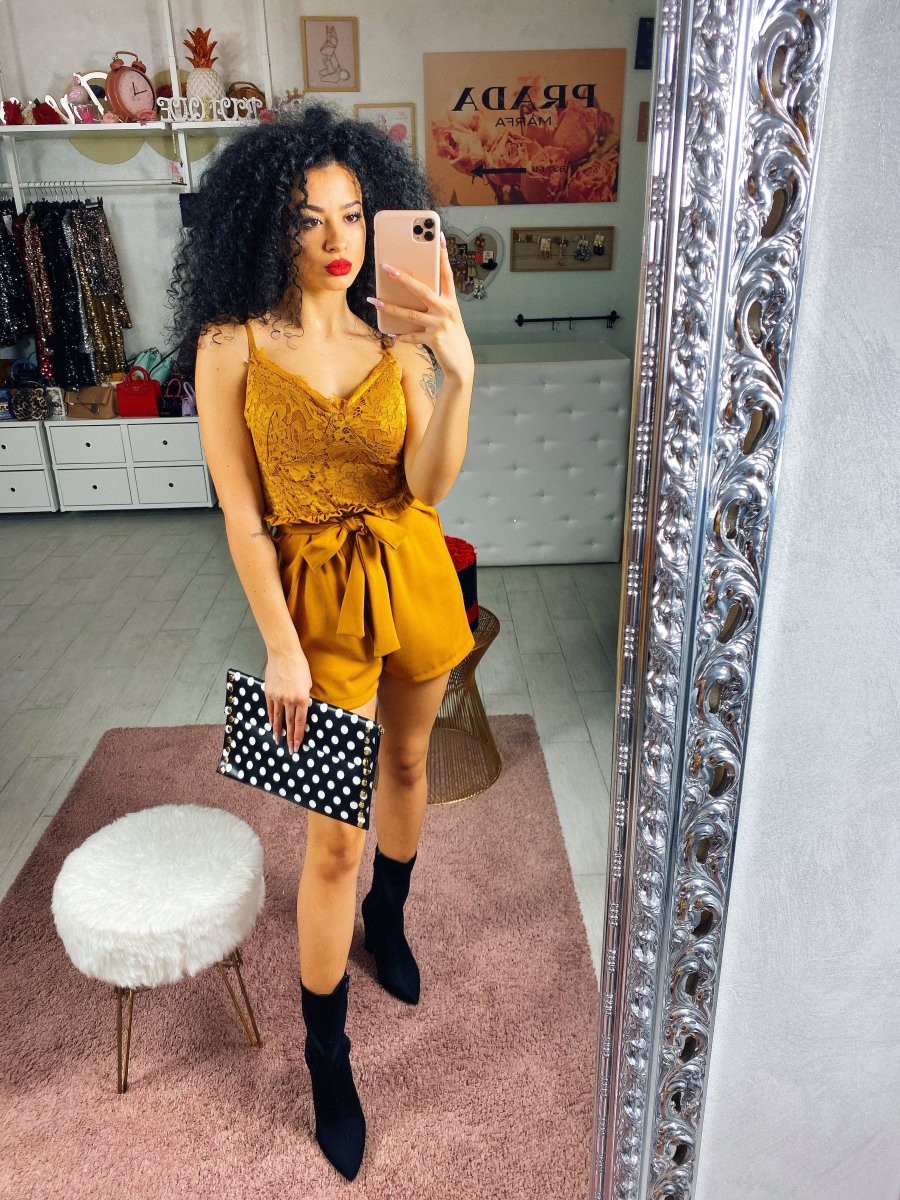 Deliziosa Tutina con top in pizzo con coppe e short in tinta con fiocco in vita. Tessuto elasticizzato ma con Vestibilità ridotta.